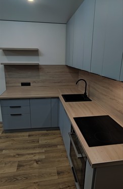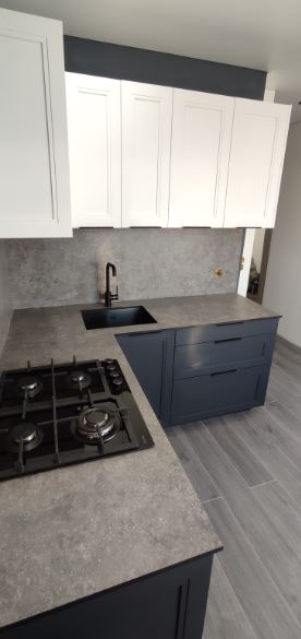 Угловая кухня с антресольными шкафами и ручкой Gola. Фасады МДФ серые матовые и белый глянец. Встроенная морозильная камера, посудомоечная машина. Подъемные механизмы BLUM AVENTOS HK-S. Подсветка интегрированна в дно антресольных шкафов и в дно верхнего яруса кухни.Фартук Аргус светлый Скиф.