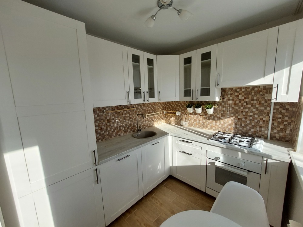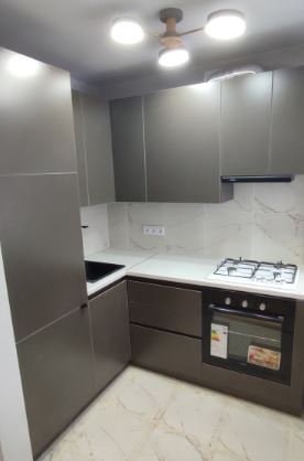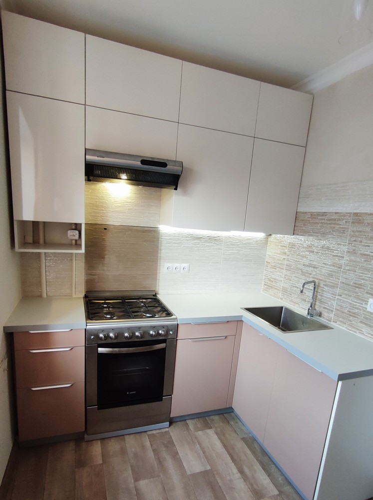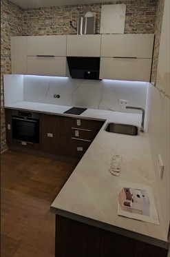 Глянцевая угловая кухня в кофейном цвете. Даже небольшая кухня может быть привлекательной и функциональной! Светлые глянцевые фасады дают глубины и воздуха помещению не утяжеляя его.
