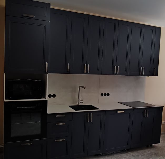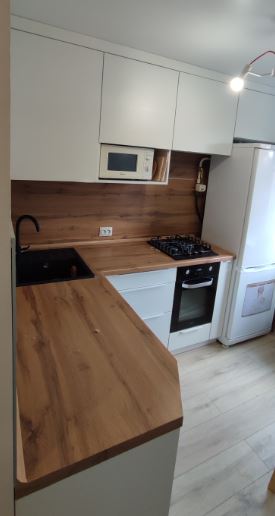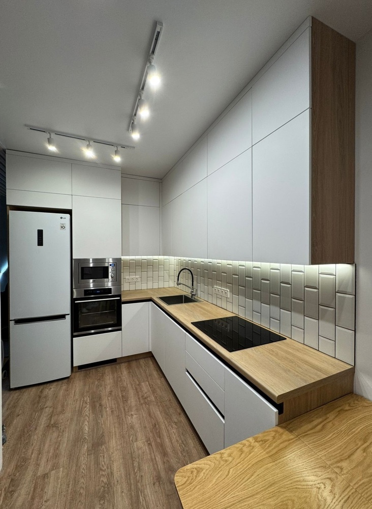 ️Белая матовая кухня в современном стиле. Корпус кухни выполнен из ЛДСП Lamarty в цвете Альберо, Фасады МДФ цвет Сантори белый Titan, столешница Slotex Дуб французский, петли и направляющие Blum, подъемные механизмы с фиксацией положения.На столешнице выполнен еврозапил.