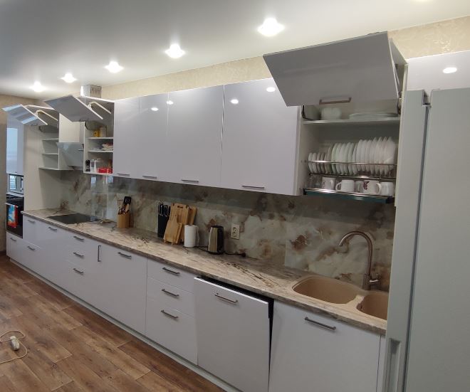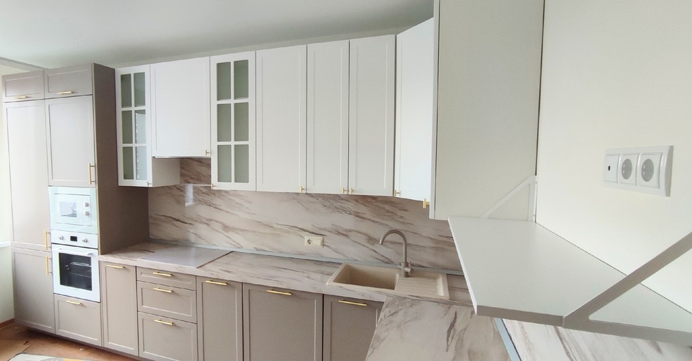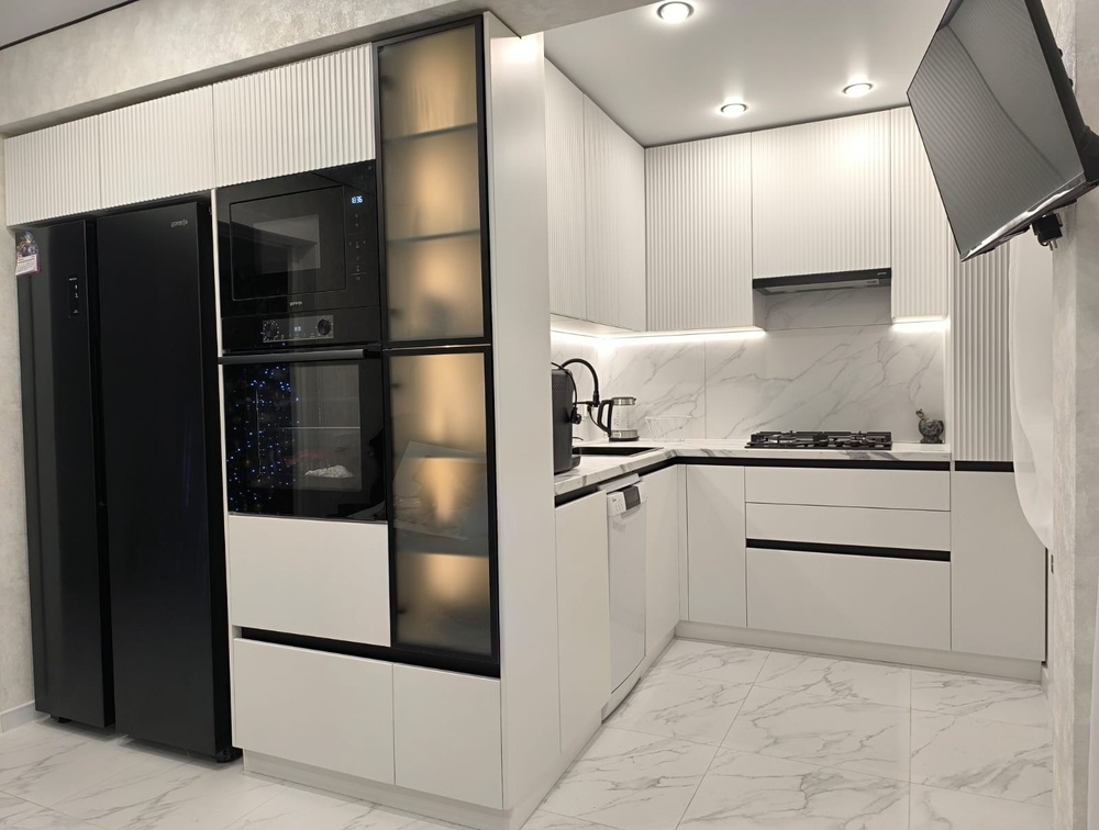 Белая кухня с рельефными фрезерованными фасадами. Данная кухня выполнена с рельефными фрезерованными фасадами и гладкой фактурой снизу, столешница Гранит белый с евро запилом, ручки GOLA, витрина с подсветкой.