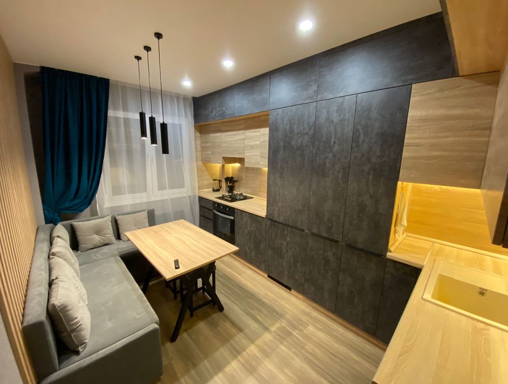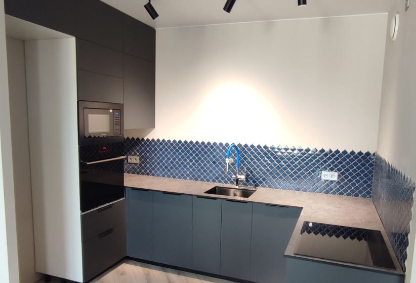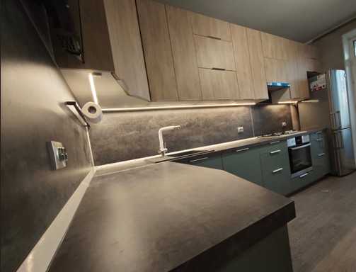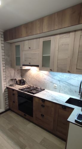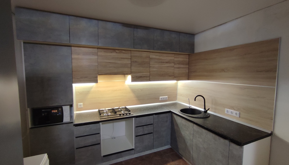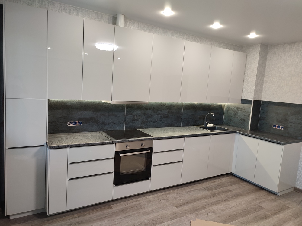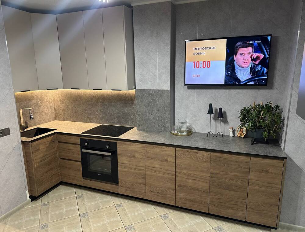 Угловая кухня с антресольными шкафами и ручкой Gola. Фасады МДФ серые матовые и белый глянец. Встроенная морозильная камера, посудомоечная машина. Подъемные механизмы BLUM AVENTOS HK-S. Подсветка интегрированна в дно антресольных шкафов и в дно верхнего яруса кухни.Фартук Аргус светлый Скиф.