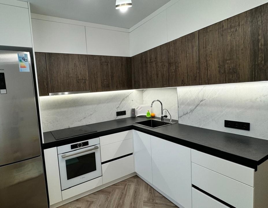 Современная светлая кухня с деревом. Фасады кухни выполнены из МДФ в цвете Агератум белый матовый и Лесной орех; ручки Gola; стеновая панель Slotex Кварцит; еврозапил.